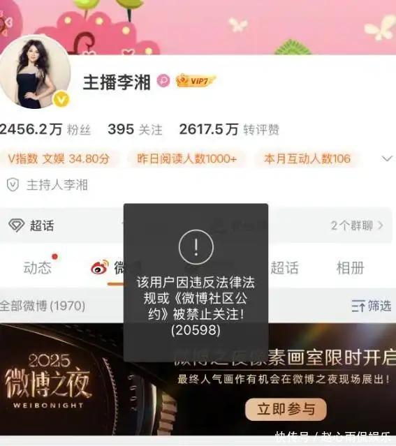今年1月,李湘微博、抖音等主流社交账号同步被限制关注,没有官方通报、没有具体缘由,一夜之间引发全网猜测。