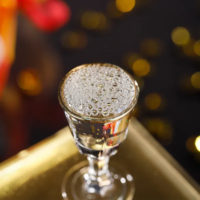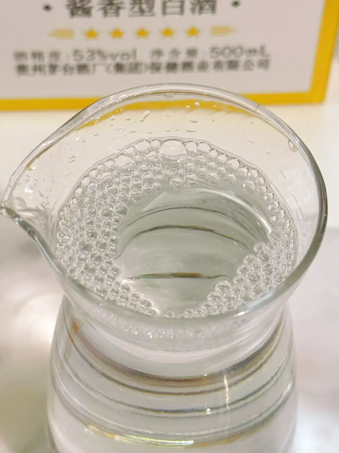 酒线细长 ,连绵不断; 酒花密如珍珠般 细密、 均匀、经久不散 。