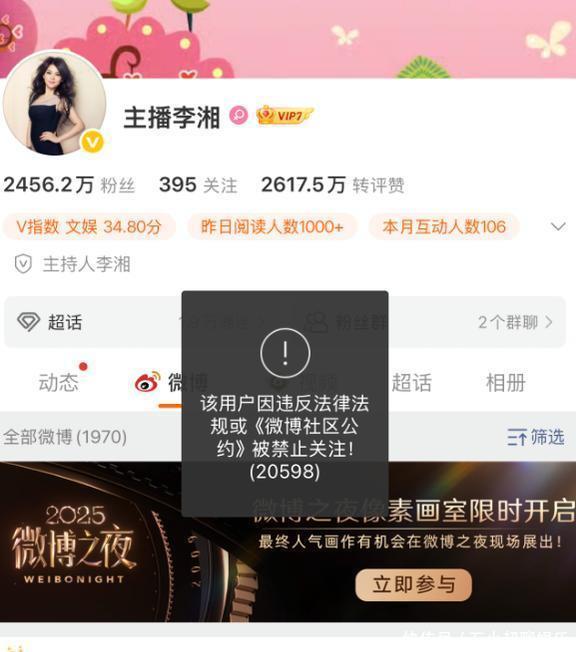 今年1月份的时候,李湘的社交媒体账号突然之间,在所有平台都不能关注了,跟被“拉黑”了似的。